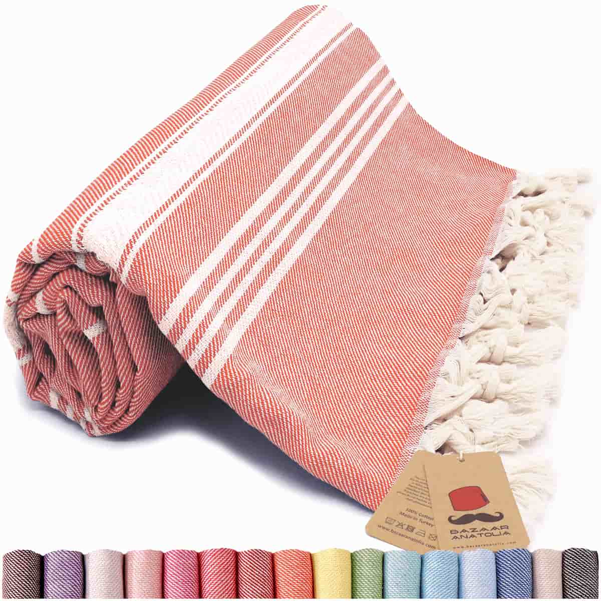 Turkish beach towel is easy to carry and takes up less space. One of the most important features of peshtemal is lightness. It weighs between 300 and 400 grams. Therefore used as an alternative to the towels in bathrooms, pools, spas, beaches, sport facilities and for baby care. It is one of the most favorite item for travelling also. For example, you can use the towel as a scarf on the outside, as a shawl on the terminal, as a blanket on an airplane, and as a beach towel when you get off the plane and go to the beach. The peshtemal fabric is made of 100% cotton.